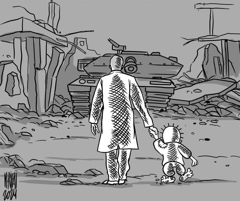 A cartoon depicting Dr Hussam Abu Safiyeh, respected doctor, humanitarian and saviour of his patients; walking alone towards “Israeli” tanks.